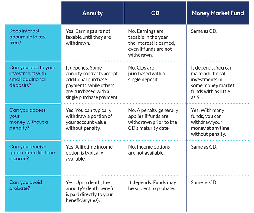 Annuities are typically used to meet long-term financial goals, while CDs and money market funds are typically used to meet shorter-term financial goals. The comparisons in this flier assume the CD and money market fund are not held in a tax-qualified account. Withdrawals and distributions from an annuity may be subject to early withdrawal charges and income tax and, for some tax qualifications, may be restricted. If withdrawals or distributions are taken from an annuity prior to age 59½, a 10% federal penalty tax may apply. Annuities and money market funds are not FDIC insured, while CDs generally are FDIC insured.