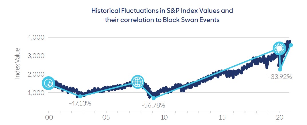 To demonstrate the correlation between stock market volatility and Black Swan Events, historical S&P (SPX) values are shown in the graph above. The connecting lines between the points represent high and low index values. The last shown value is as of 12/31/2020. Index values fluctuate over time.