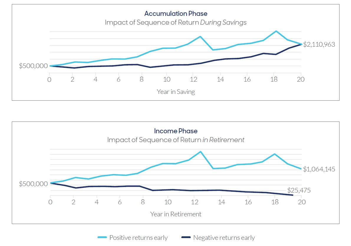 Take a look at how a $500,000 portfolio fares during the accumulation and income phases when it experiences early positive returns vs. early negative returns: