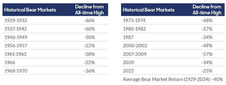 The table below shows historical bear markets since 1929 - with the average bear market return being -40%1.