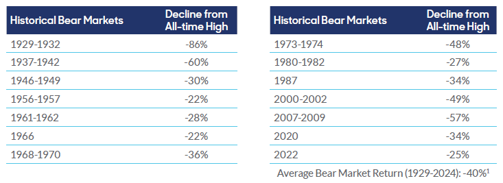 1J.P. Morgan Asset Management, Guide to the Markets - U.S., Data as of December 31, 2024. (Average return is representative of bear markets from 1929-2024).