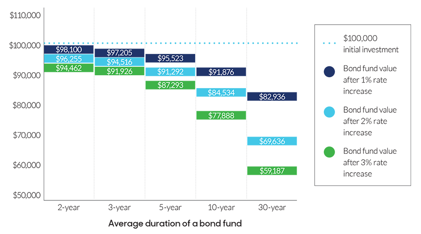 Example assumes starting interest rates of 2.52% for 2-year duration bond fund, 2.64% for 3-year, 2.80% for 5-year, 2.97% for 10-year and 3.11% for 30-year.