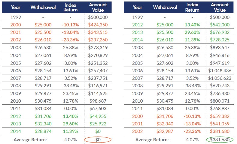 In both scenarios, the average return is the same. However, early negative returns caused the portfolio to deplete to $0 over fifteen years, where early positive returns left a portfolio balance of over $381,000.