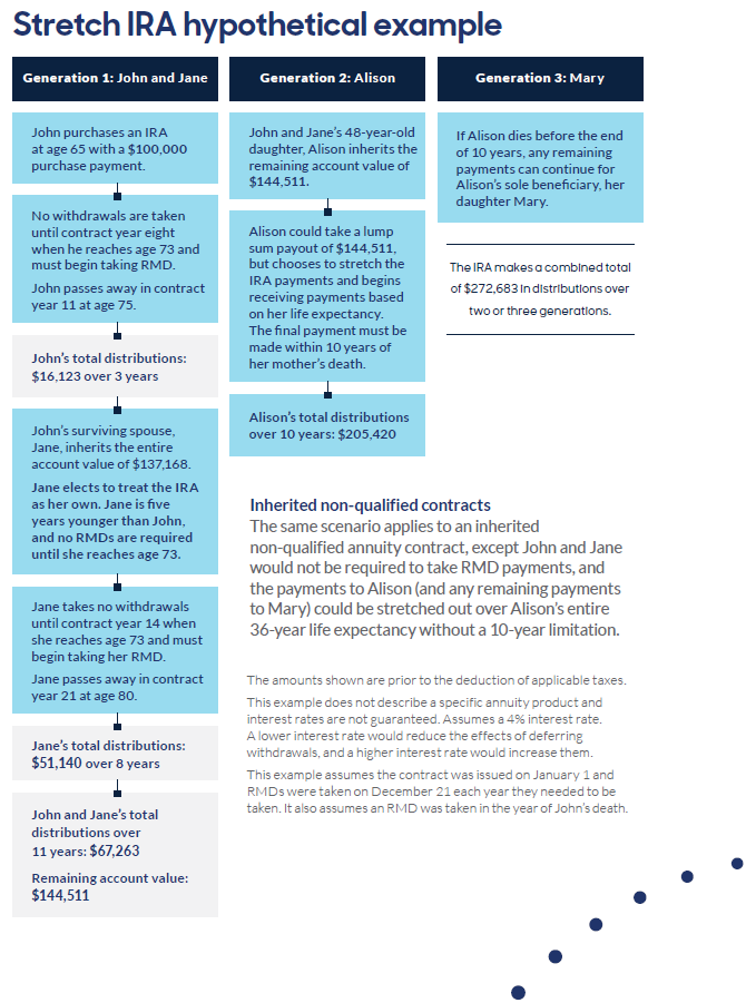 If your beneficiary stretches out payments from your IRA or non-qualified annuity, but dies before all benefits are paid, any remaining balance can be passed on to future generations.