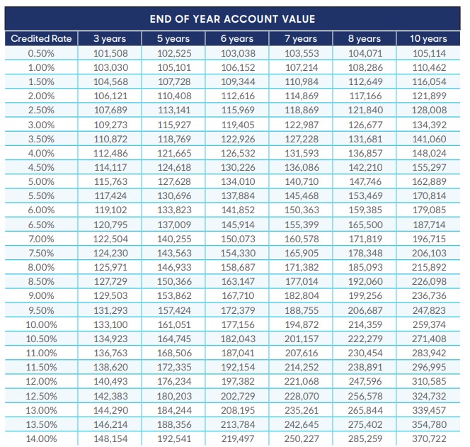 The following table shows how a hypothetical $100,000 purchase payment would grow at various interest rates and over various time periods.